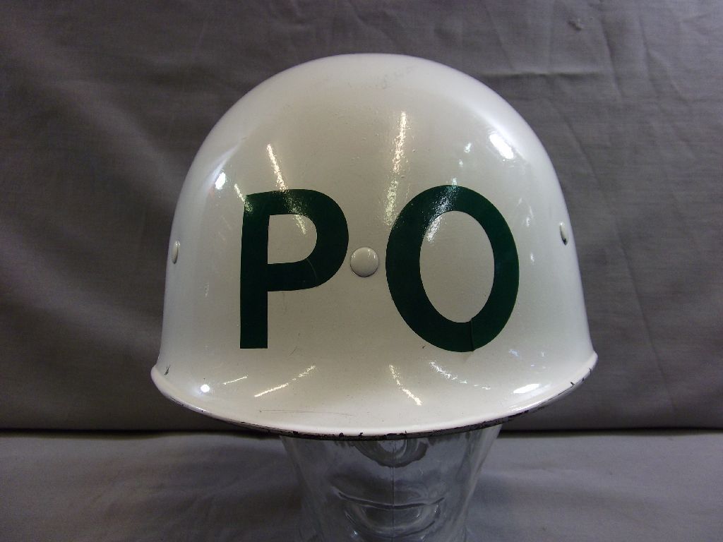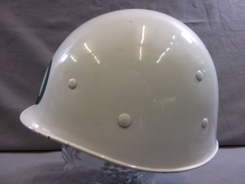 Innenhelm für Helm der Militärpolizei der Heimwehr, Plastik weiß mit PO in grün Innenhelm komplett mit Kinnriemen, keinen Hersteller und keine Grösse gefunden, Zustand 1 Enthält nichttextile Teile tierischen Ursprungs.
