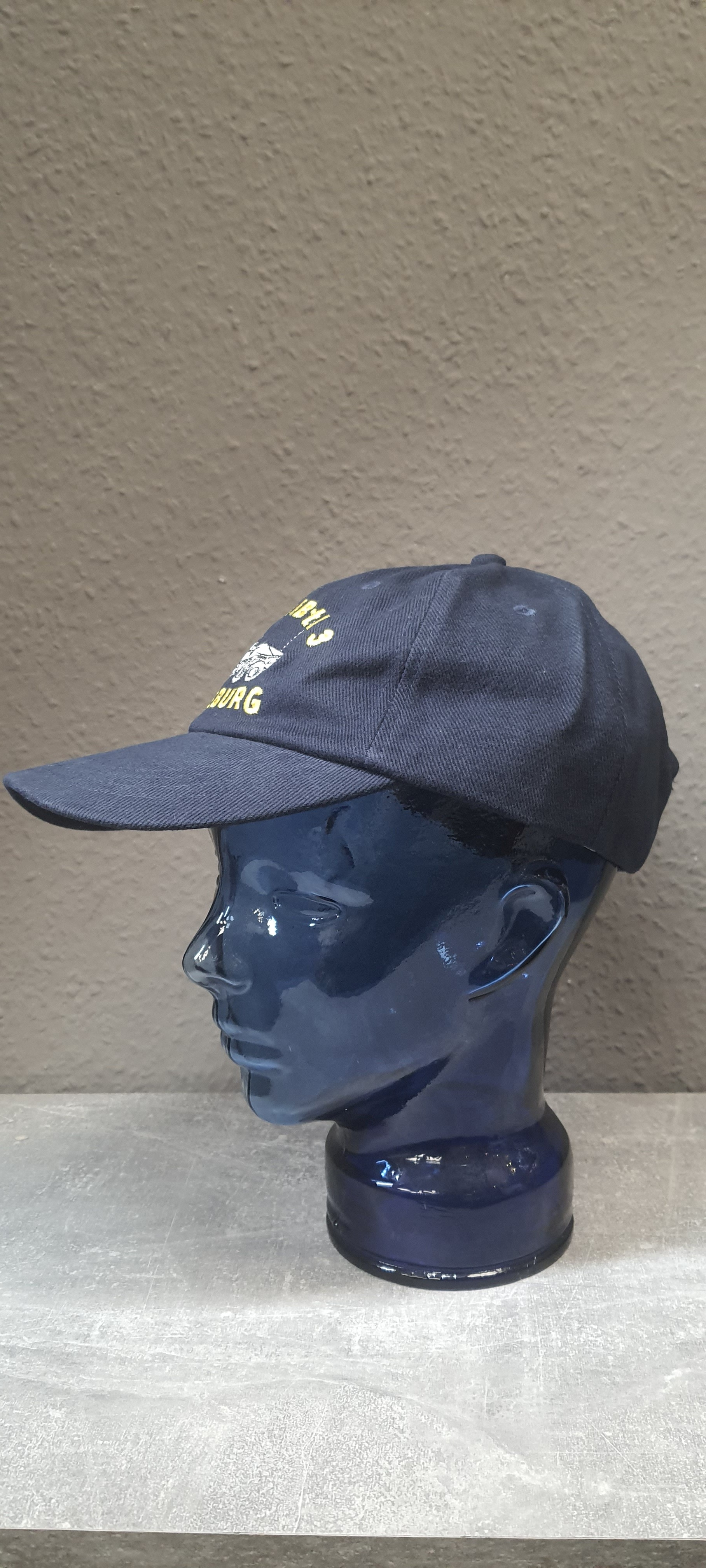 blaue Kappe mit eingesticktem Schriftzug und Abzeichen