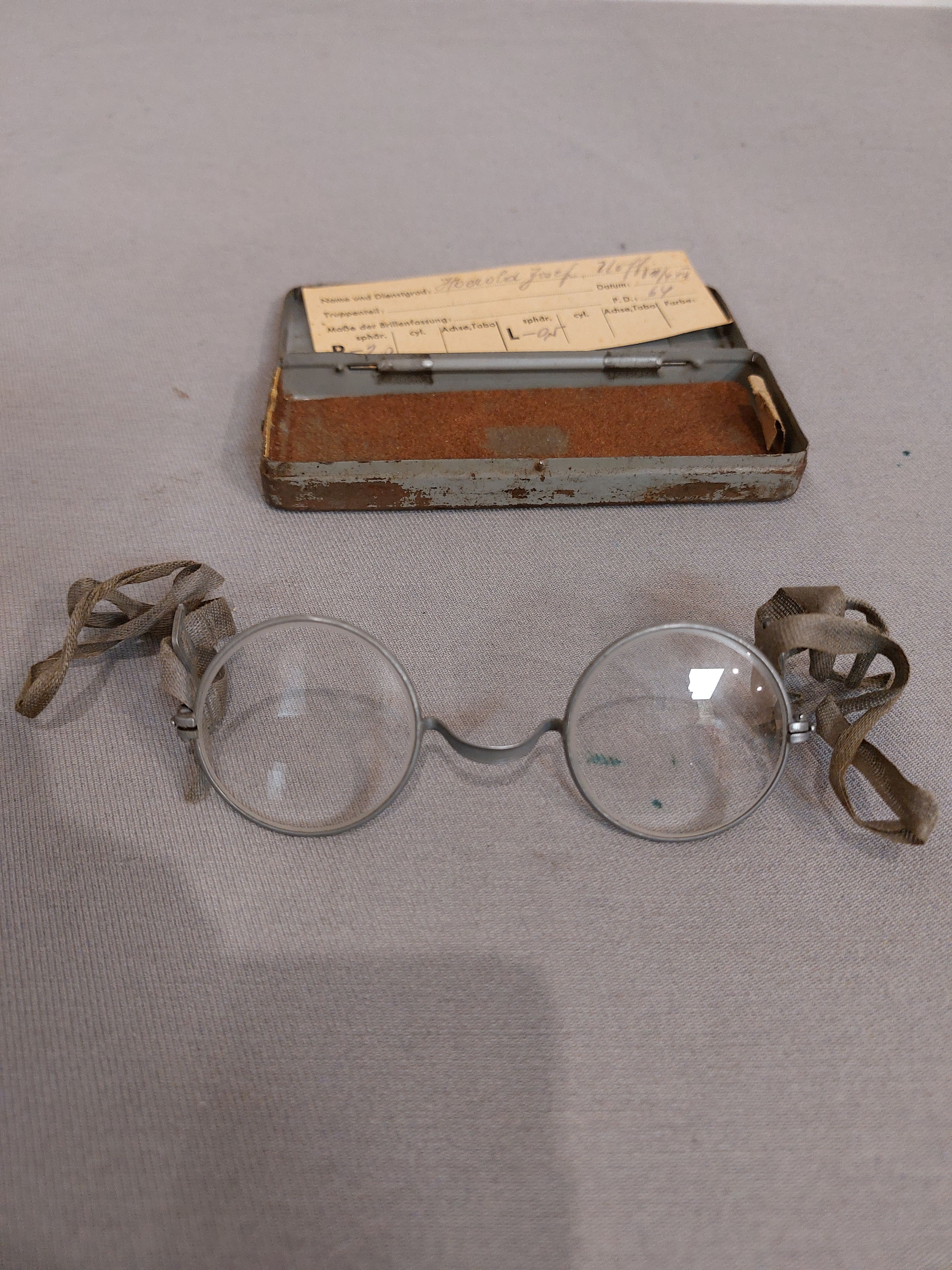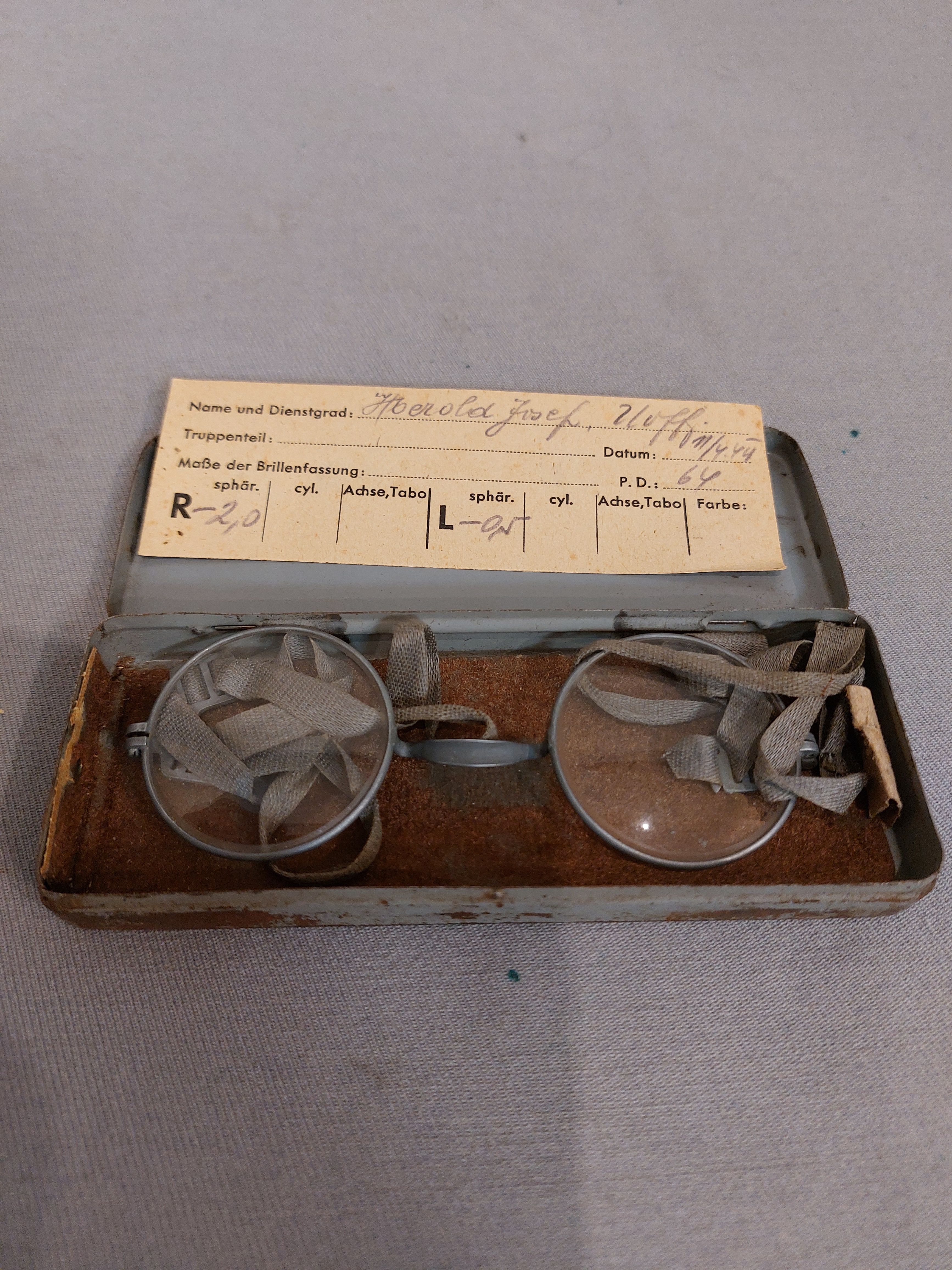 Wehrmacht Masken Brille im Etui mit Namenszettel innen