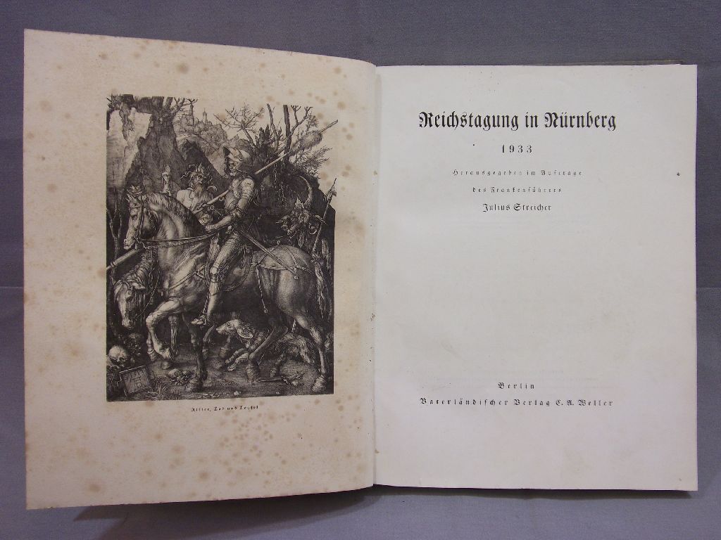 Reichsparteitag Nürnberg 1933, Herausgegeben im Auftrage des Frankenführers Julius Streicher Berlin Vaterländischer Verlag C.A. Weller 1933, 264 Seiten mit zahlreichen Abbildungen, blaues Leinen mit Titelvignette in Gold, Buchrücken fehlt, Zustand 3