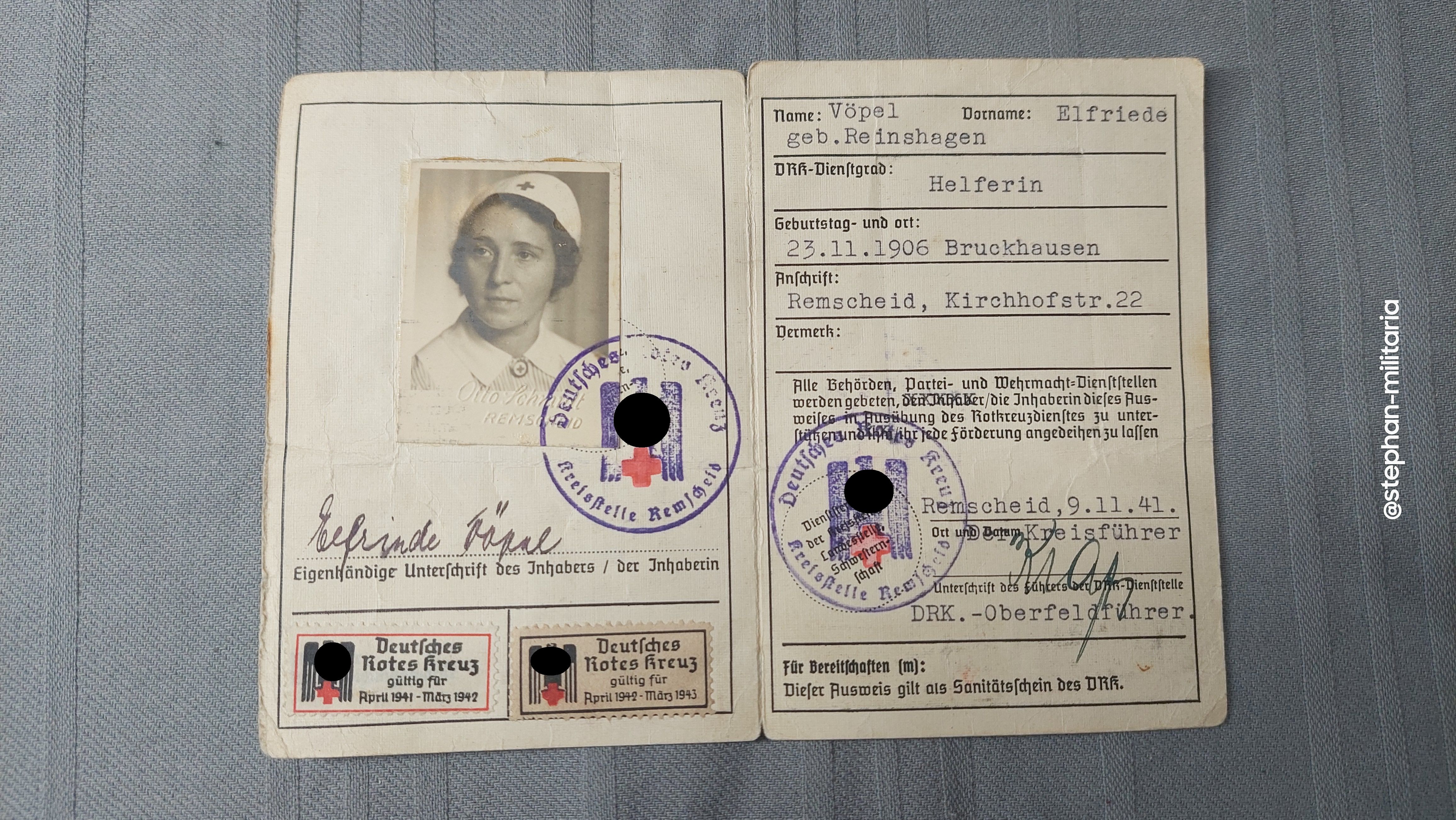 3.Reich Deutsches Rotes Kreuz Personal-Ausweis Helferin von 1941 - Remscheid DRK