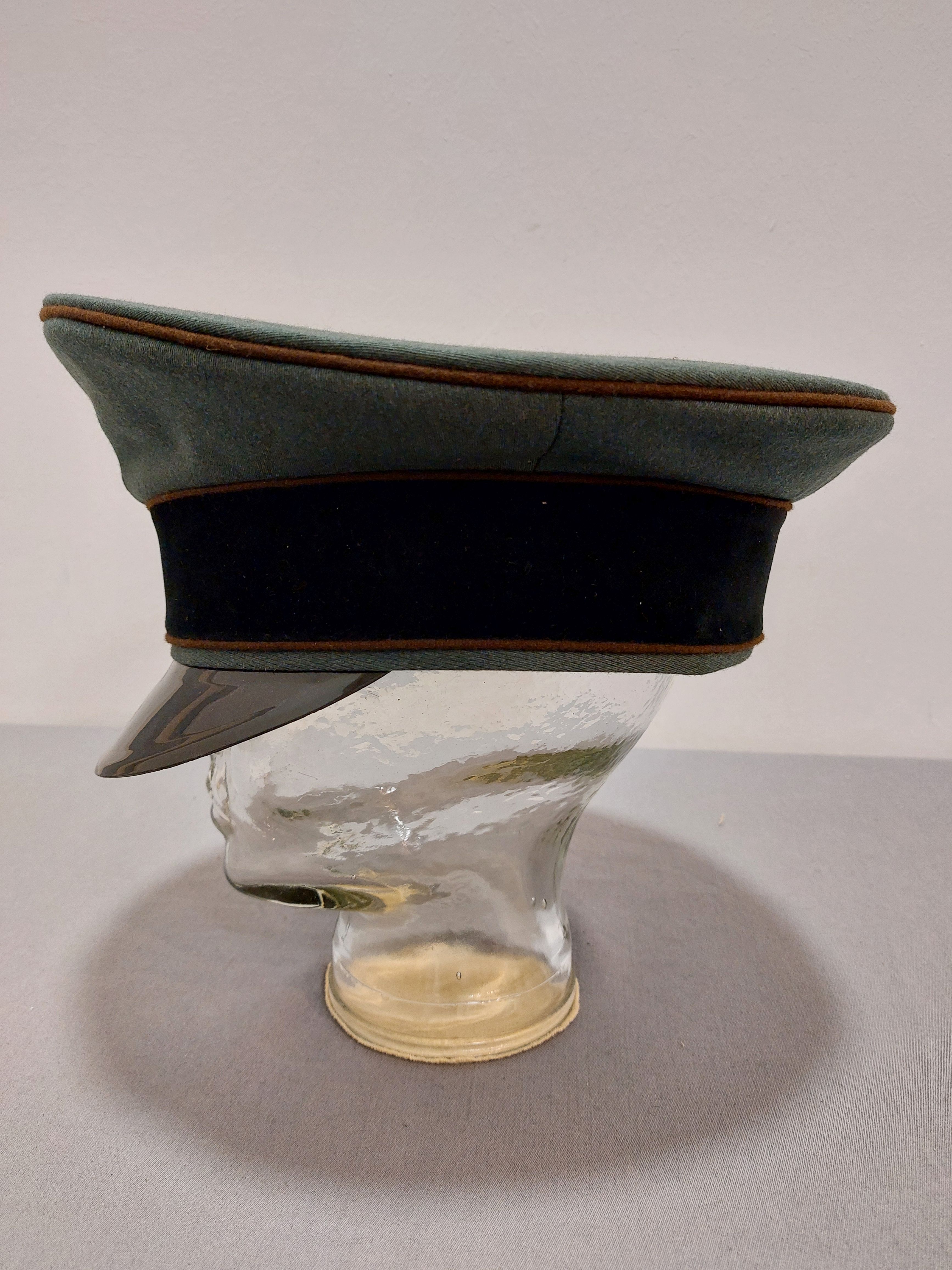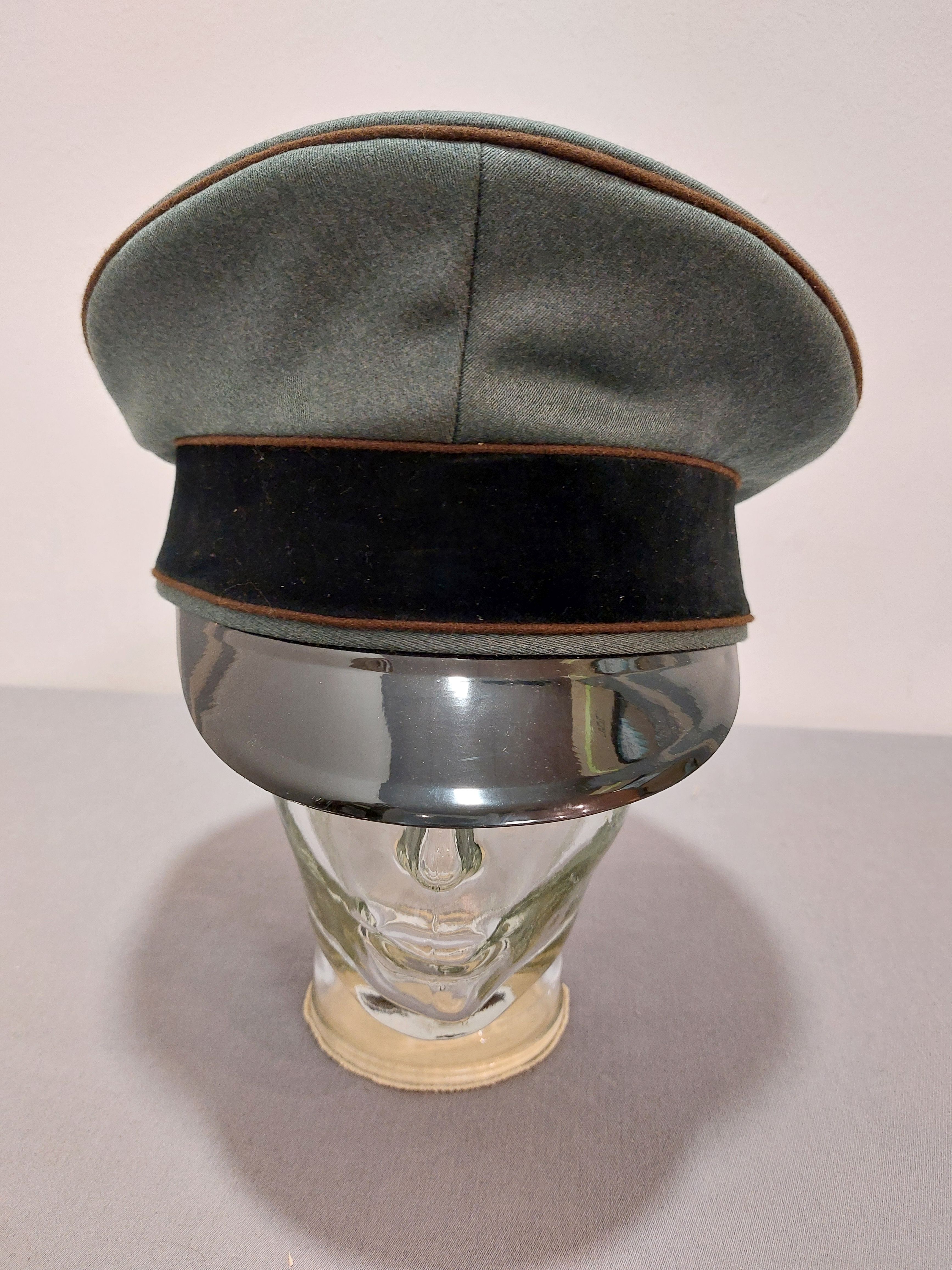 Schirmmütze, Offizier, feldgrau Trikot, Besatzstreifen schwarzer Samt, braune Paspel, ohne Hersteller, ohne Abzeichen, Kunststoffschirm