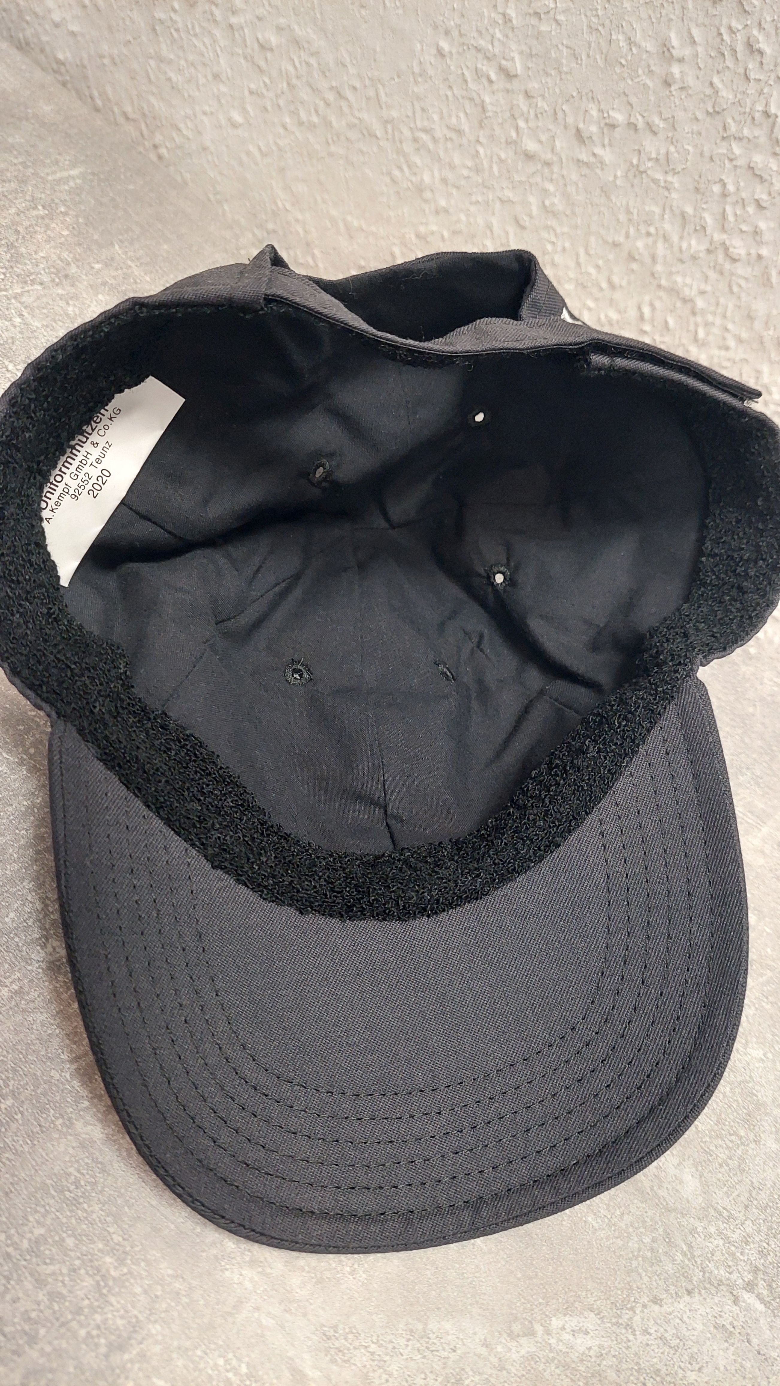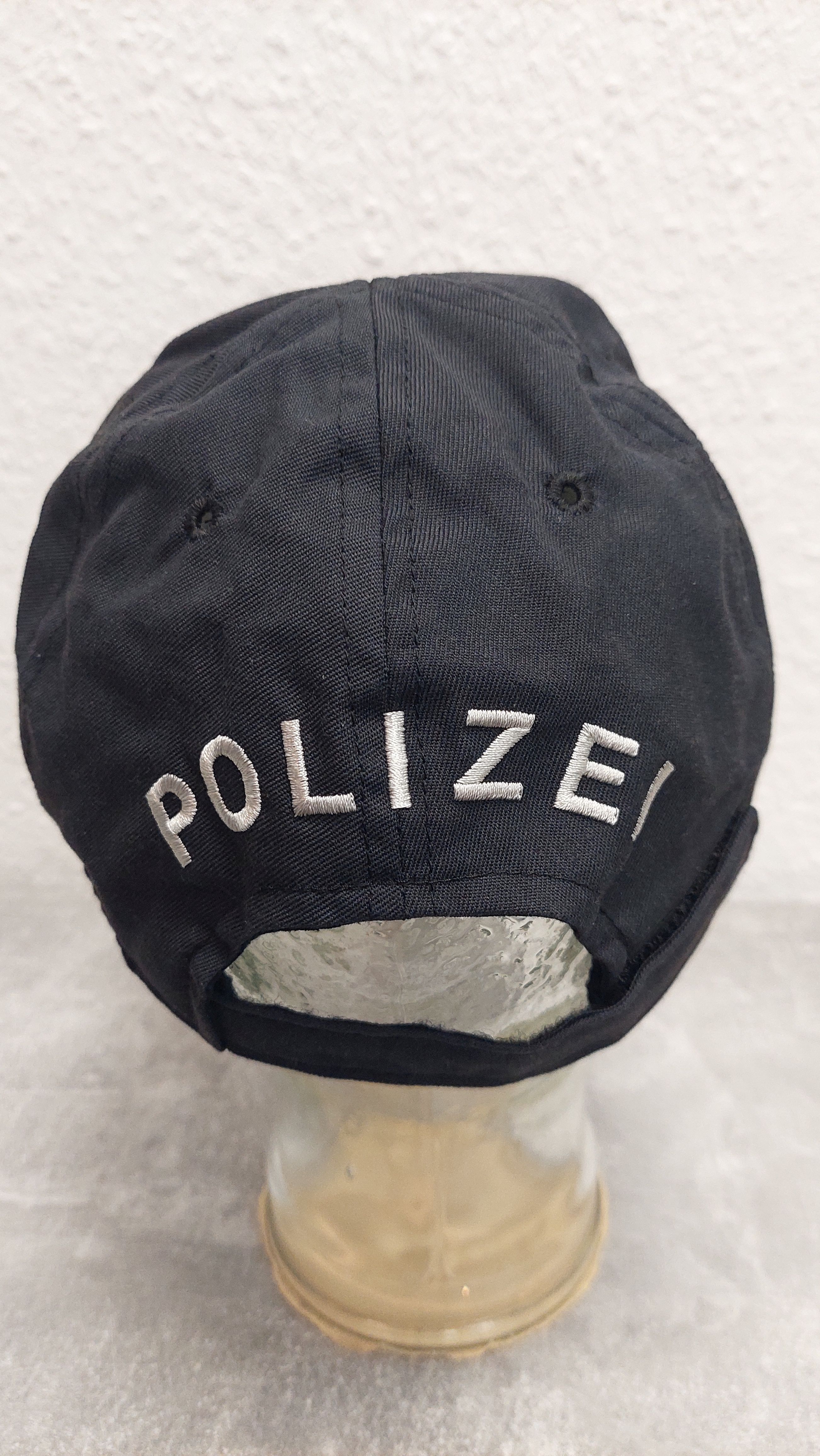 schwarze Kappe mit vorne eingesticktem Stern und Schriftzug Polizei, Rückseite nur Schriftzug Polizei